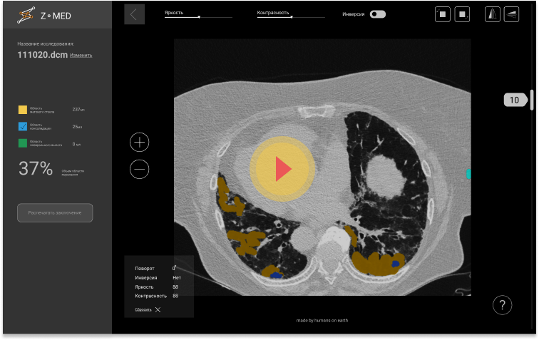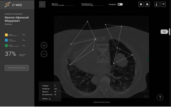 Detection of COVID19 patterns on CT examination: Frosted glass, consolidation area, pleural effusion, determination of the percentage of lung infection